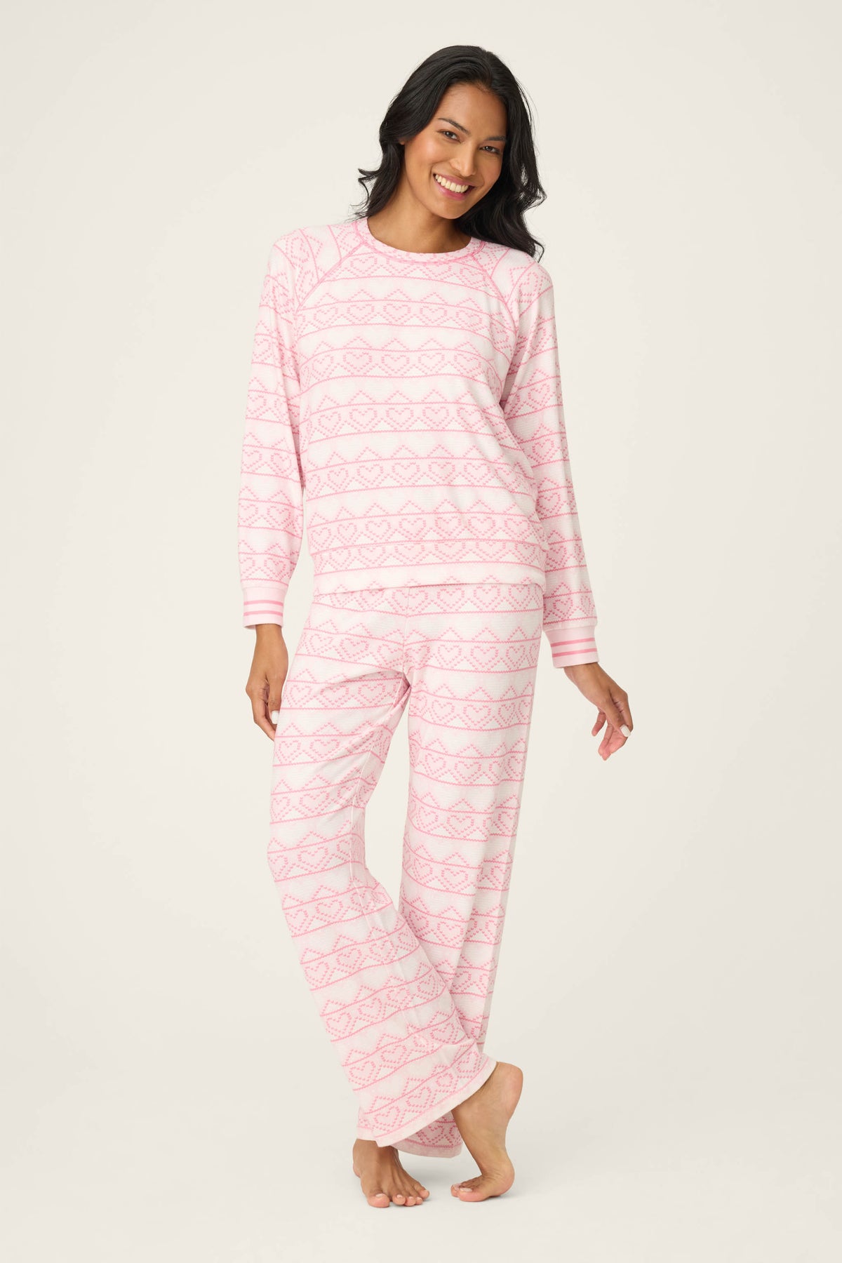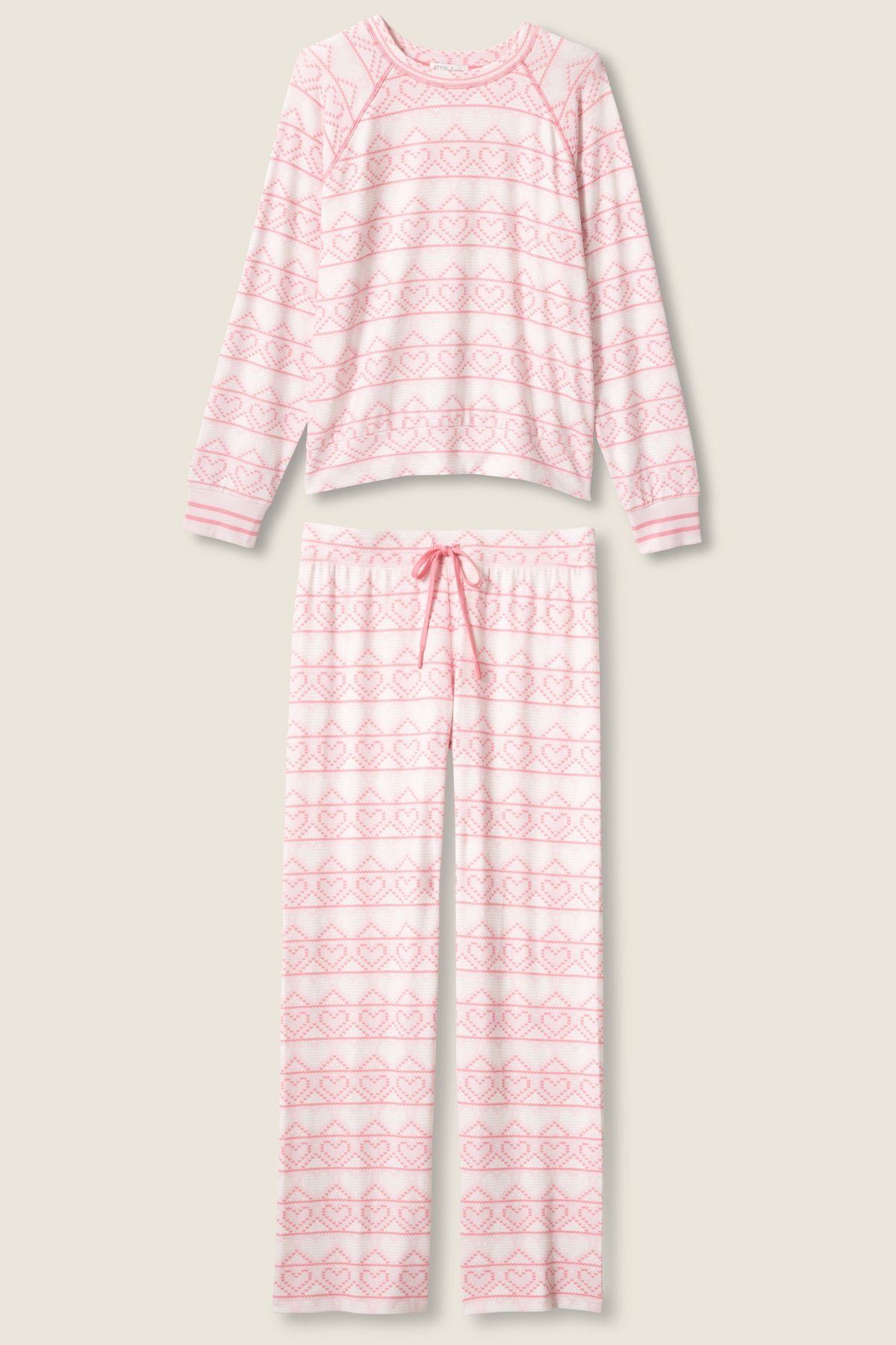 Women’s pink pajama set in soft peachy jersey with a heart Fair Isle print, featuring a long sleeve crewneck top and matching relaxed pants.