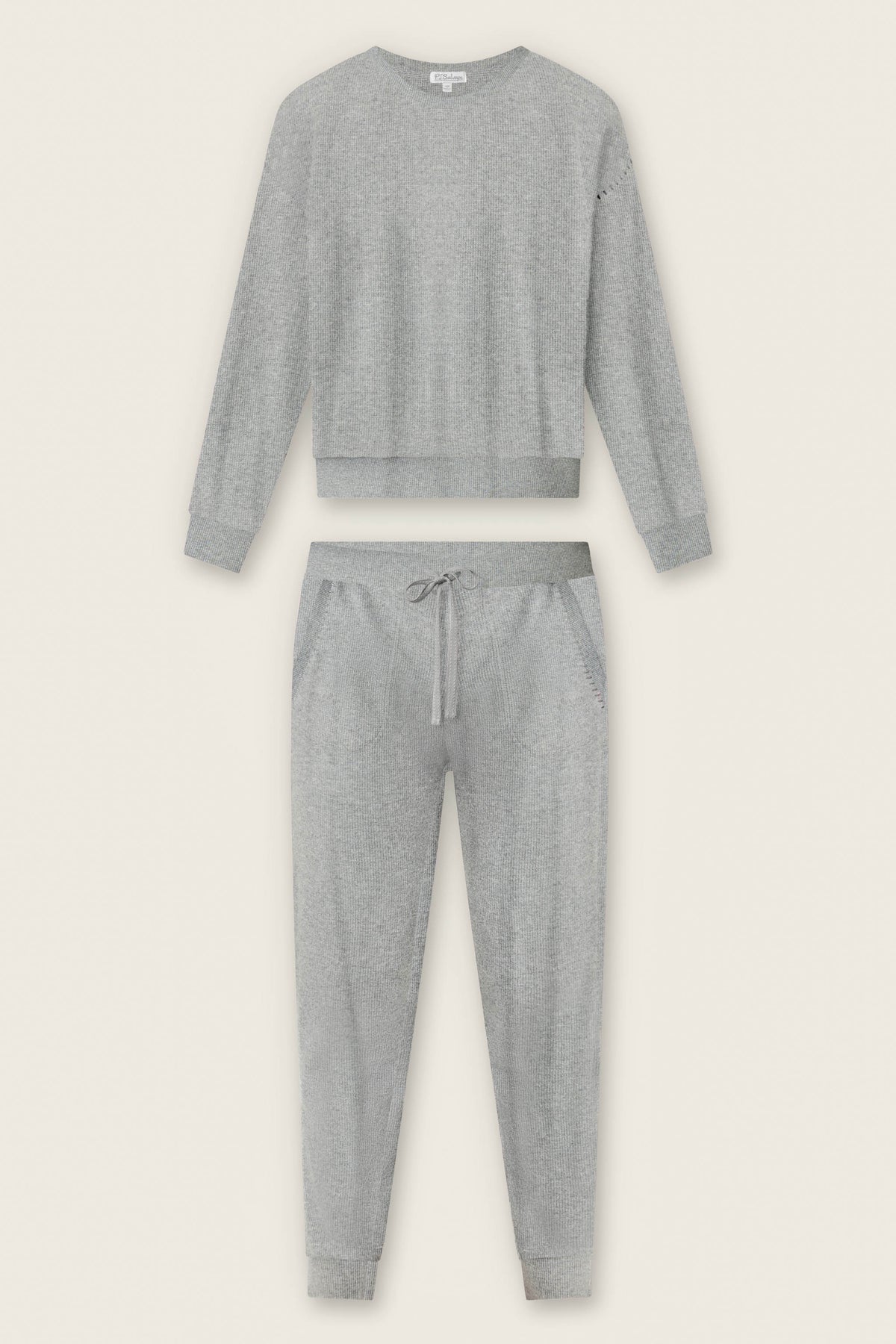 Cozy waffle texture meets laid-back charm in this soft crewneck-and-jogger lounge set. Crafted from stretchy waffle thermal, it features contrast whipstitch detailing along the drop-shoulder seams and pocket edges for a subtle crafted touch. The jogger pants include an elastic waistband with a stitched drawstring and banded cuffs for that classic cozy fit. In a medium heathered grey, it’s an easy, everyday neutral made for winding down.