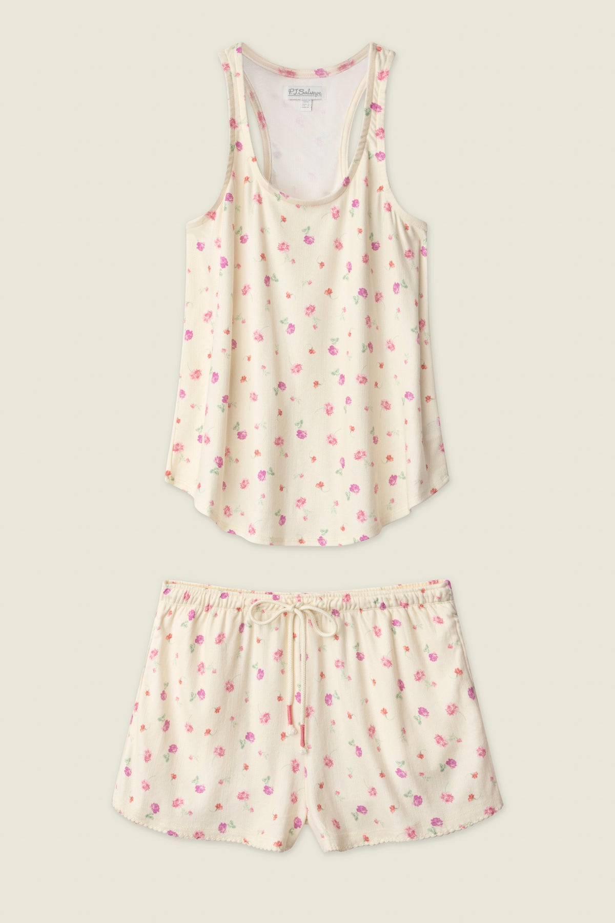 Sweet florals, easy comfort. This butter‑yellow pajama set is crafted in mid brushed pointelle for a soft, lightly textured feel with comfortable stretch. The scoop‑neck tank features a delicate petal‑back design with overlapping panels, pairing with relaxed shorts that include a drawstring waistband and pockets. A lettuce‑edge hem adds a charming, feminine finish.