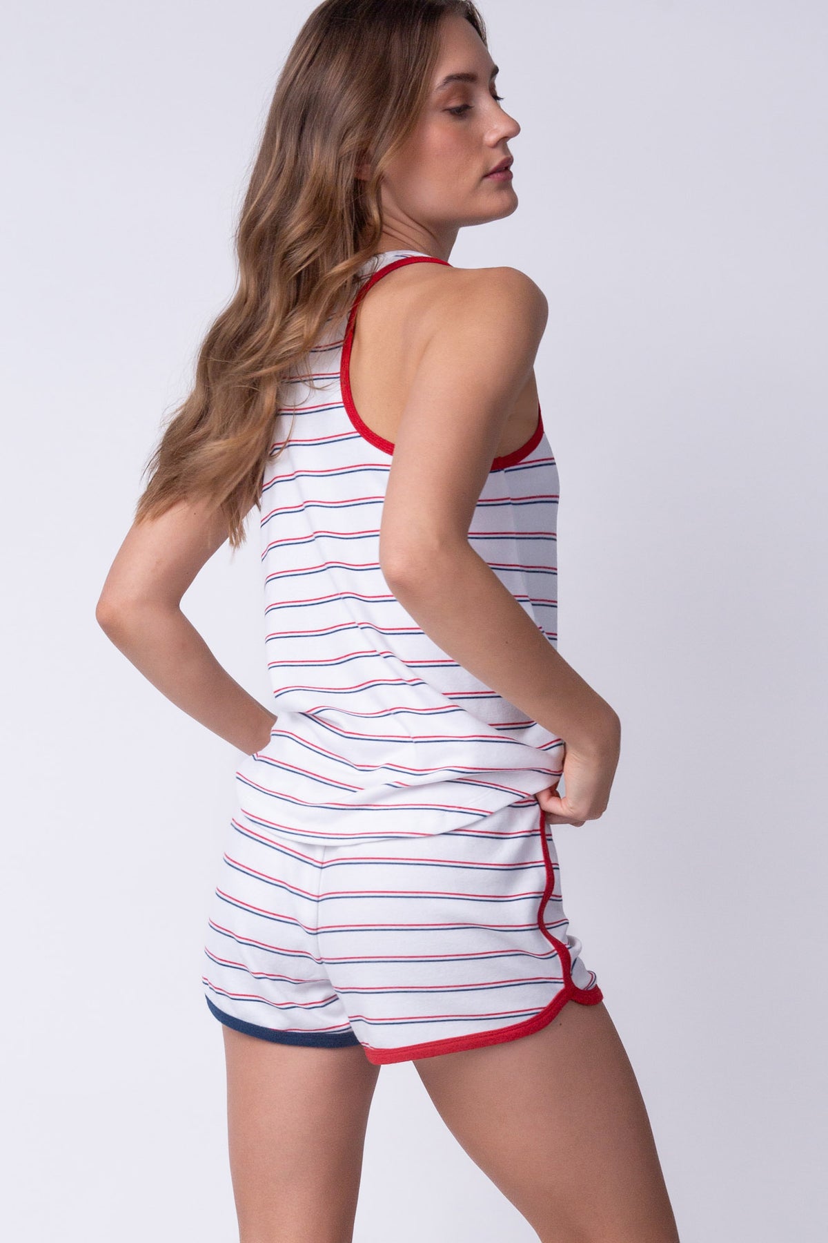 Red, white, and cool striped shorts with contract braided rope drawstrings are made for long summer days and warm summer nights.