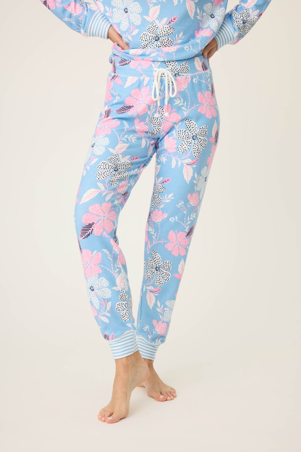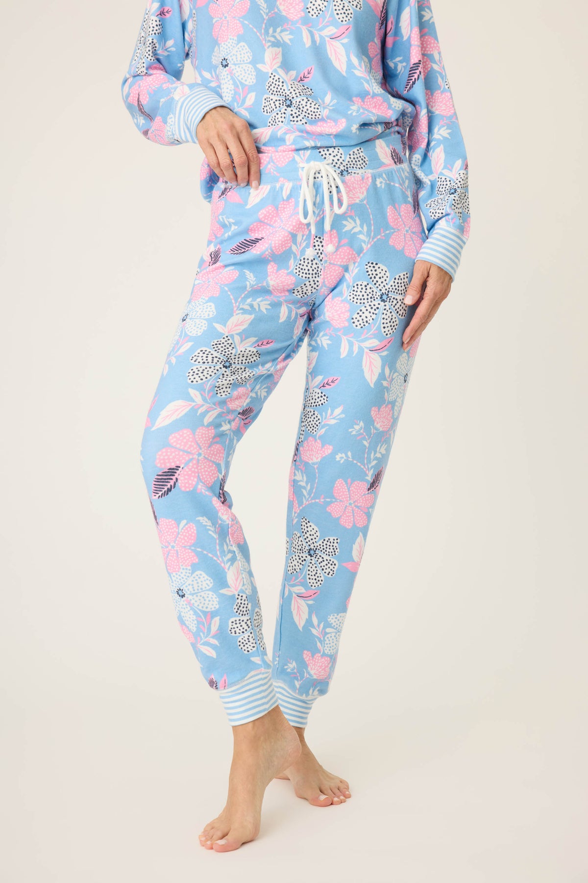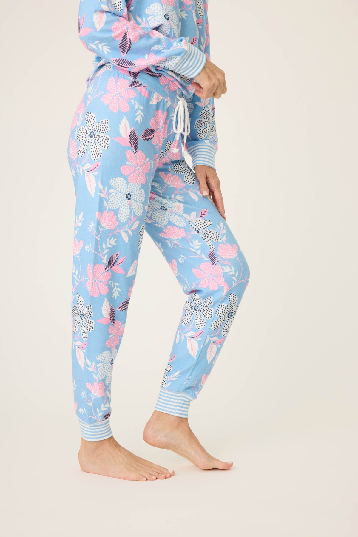 - Ivory-blue-pink winter floral pj jogger with striped cuffs