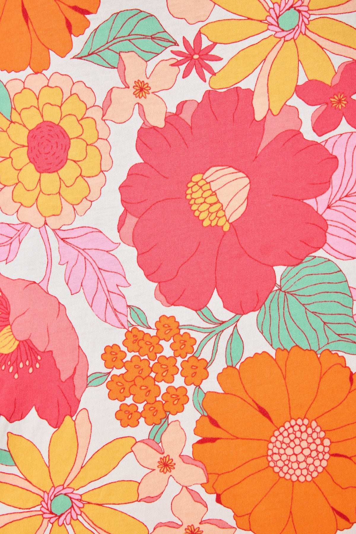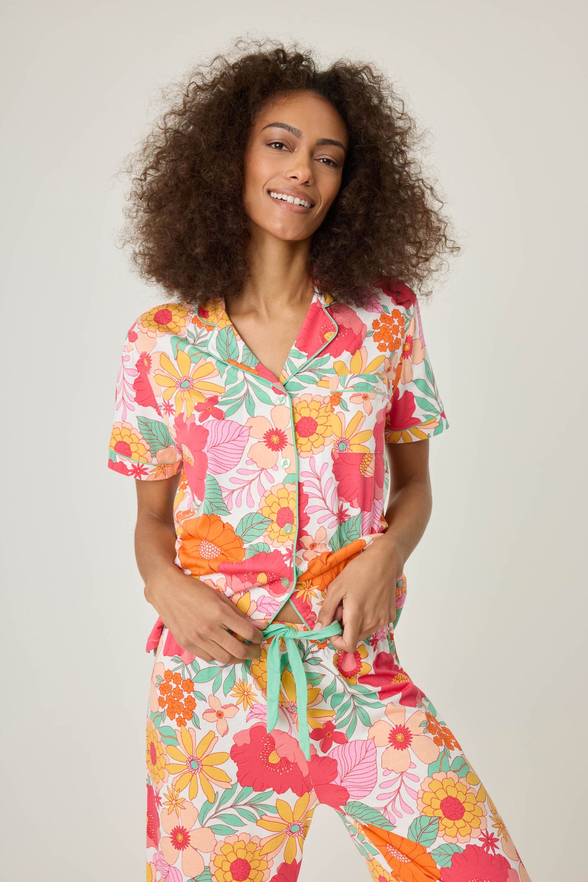 Brighten up your lounge or sleepwear collection with this vibrant coral-orange pajama set, adorned with a lively yellow floral print. Crafted from breathable cotton-modal jersey, it includes a button-front short sleeve top and cropped open-leg pants. Aqua piping and a tie-waist detail lend a fresh and cheerful finishing touch.